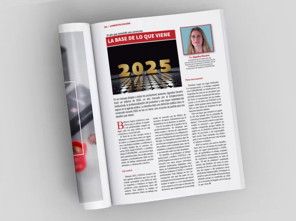 Un 2025 intenso dejó resultados visibles: más presencia del seguro en la agenda pública, profesionalización del PAS, articulación política y una campaña que instaló conciencia aseguradora. Un balance de Agustina Decarre, presidente de FAPASA, que mira hacia adelante y no hacia atrás, publicado en la revista Todo Riesgo.